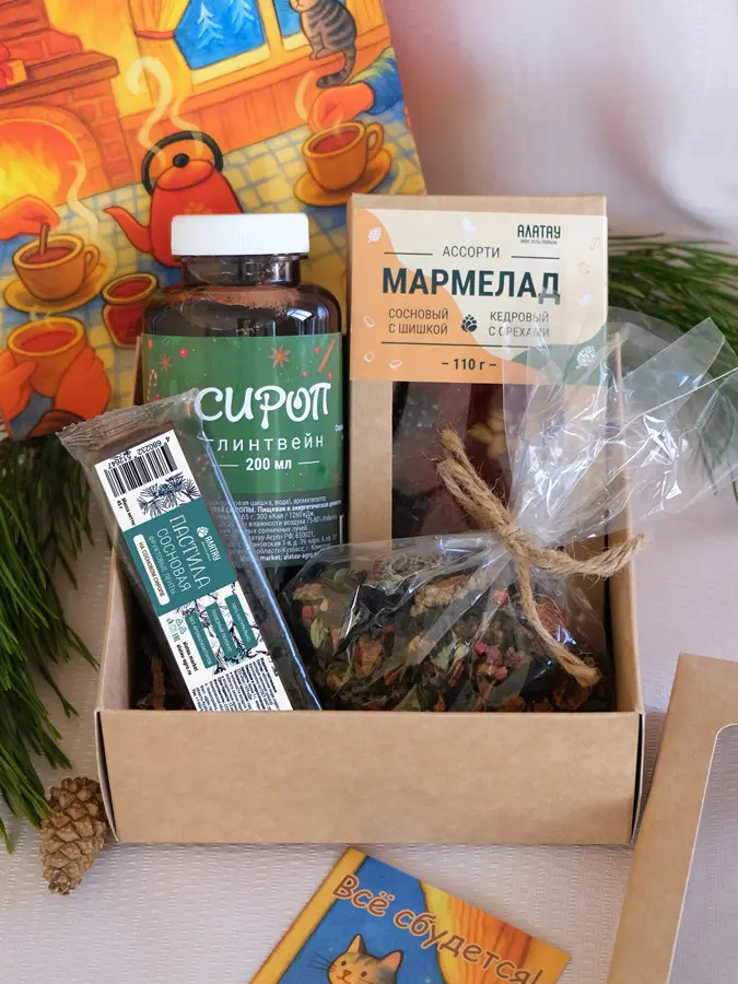 Мармелад Ассорти с сосновой шишкой и кедровыми орехами 110 гр - 1шт; Сироп Глинтвейн 200 мл - 1шт; Чайный сбор Таёжный - 1 пак.; Пастила сосновая 45гр - 1 шт.